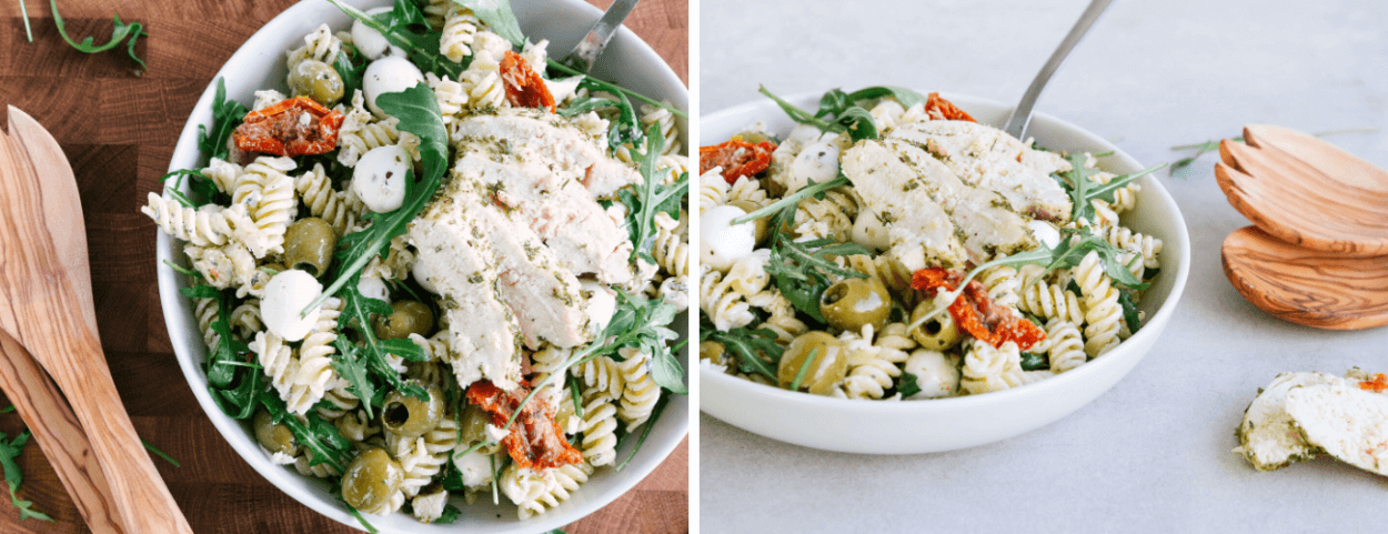 Een heerlijke pastasalade met kip die kan dienen als maaltijdsalade of als bijgerecht. Vanwege de zure room op de pasta en de olie van de zongedroogde tomaat en de olijven heb je geen dressing nodig; hussel de salade door elkaar en de smaakjes en olie zullen door de hele salade aanwezig zijn.
